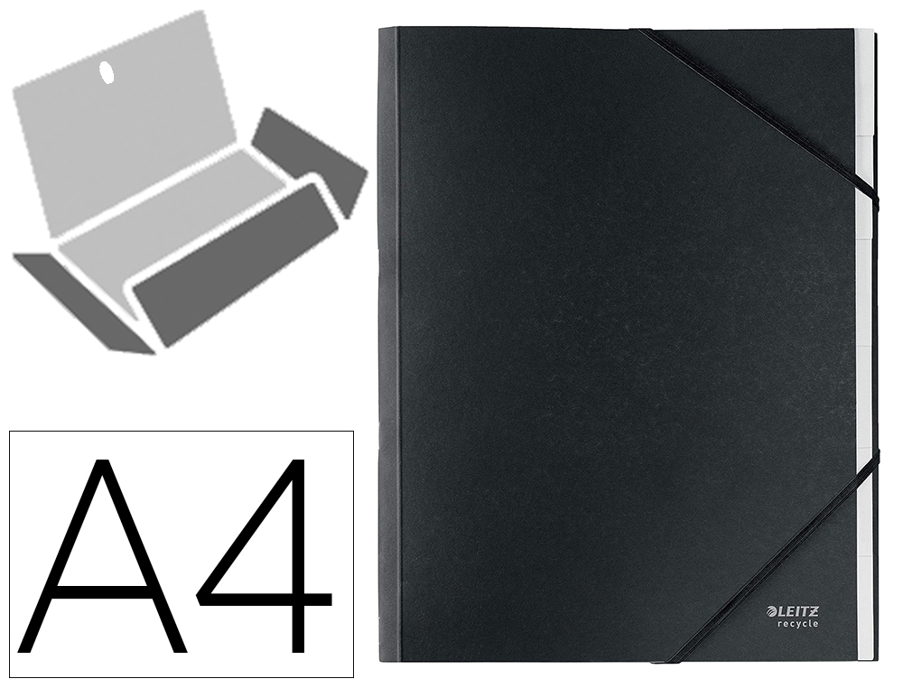 Le TRIEUR LEITZ 6 ONGLETS RECYCLE FERMETURE ELASTIQUES COLORIS NOIR est un organisateur de documents de haute qualité conçu pour répondre aux besoins de classement à la fois professionnels et personnels. Fabriqué en carton 100% recyclé, ce trieur écologique est durable et respectueux de l'environnement.